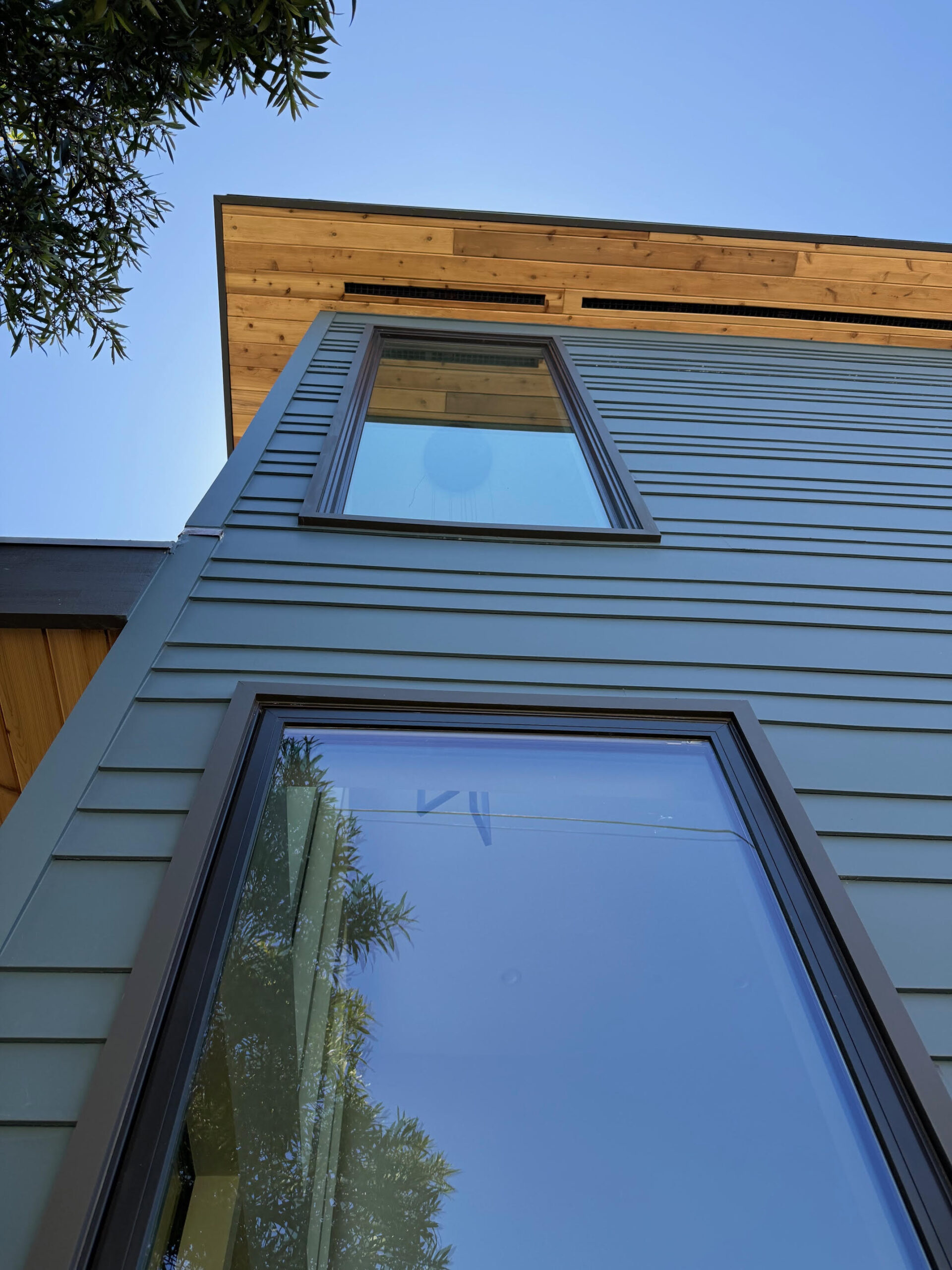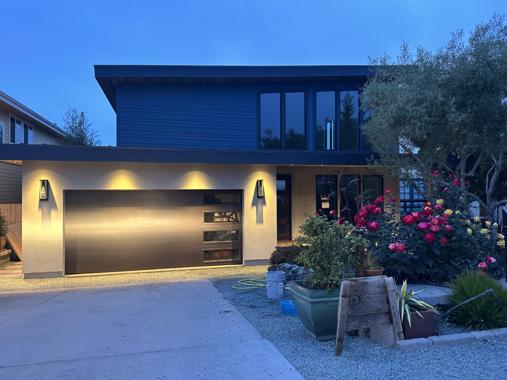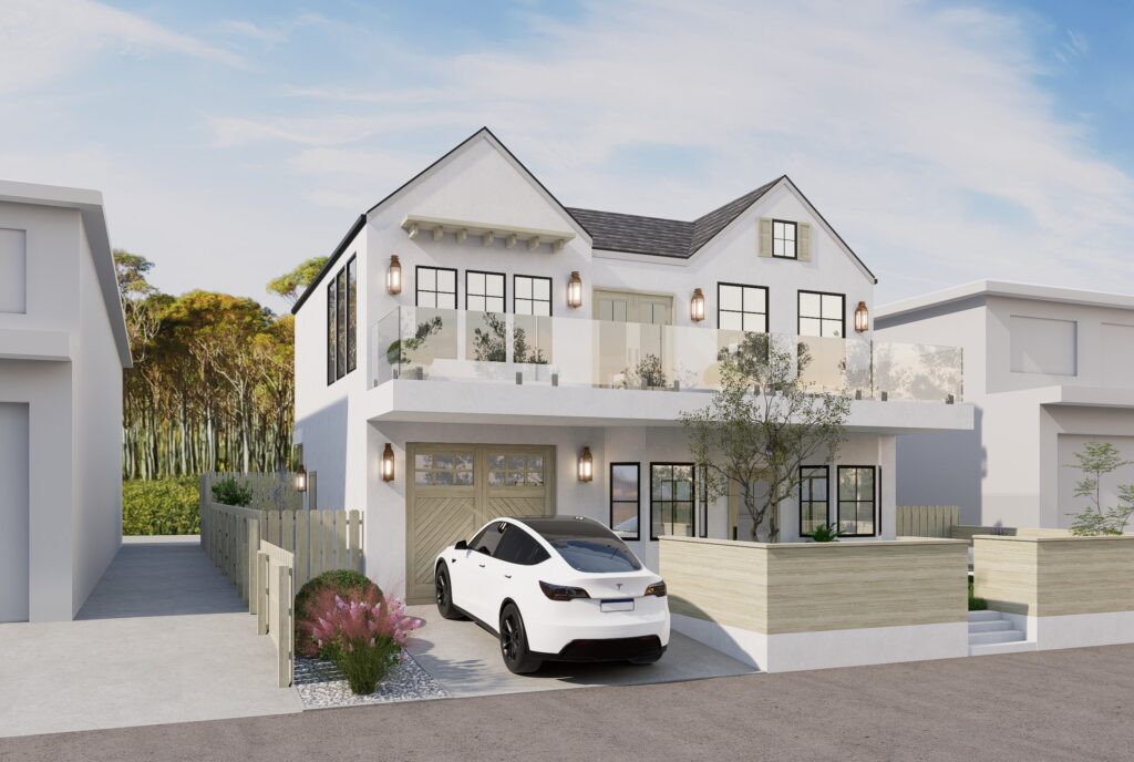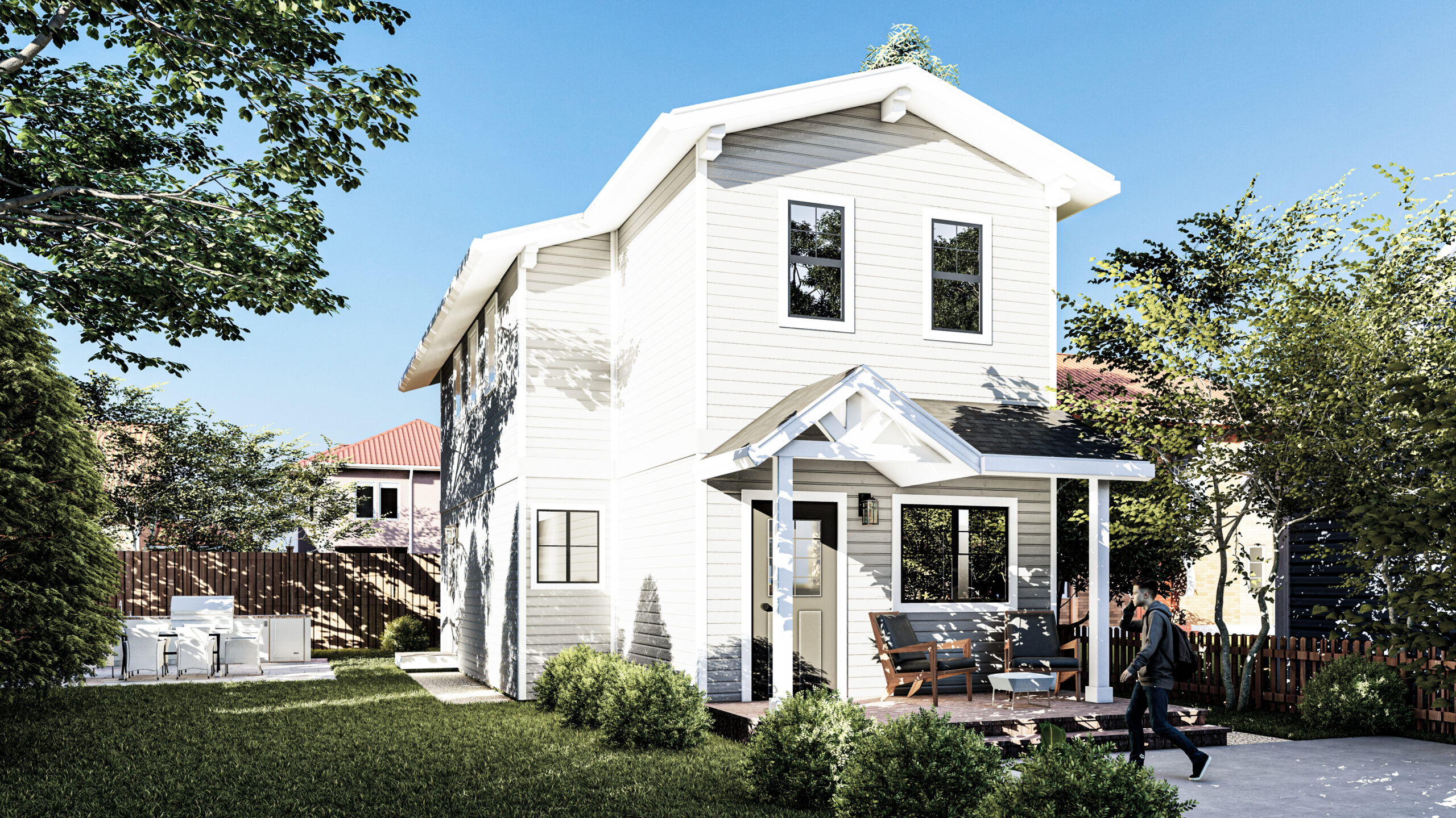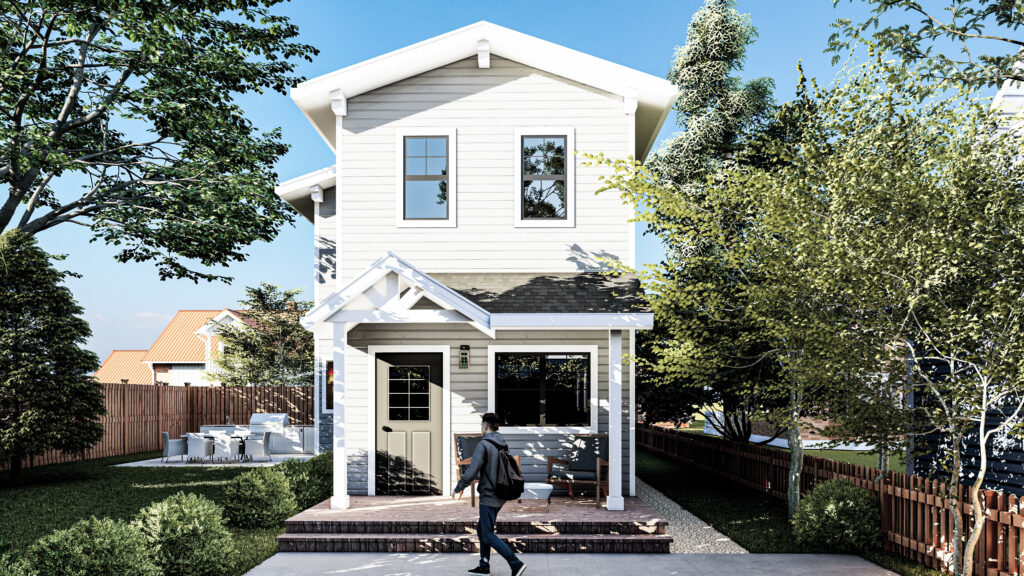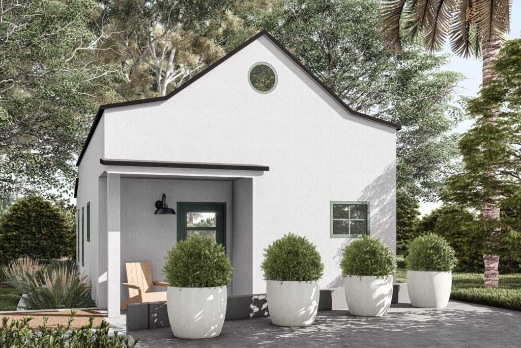 Utilizing the benefits of prefabricated design, this custom modular 1,200 SF four-bedroom accessory dwelling unit (ADU) is actually constructed out of two separate prefab units stacked on top of each other. The constrained lot presented challenges to landing the units, so the prefab manufacturer craned each unit in lifting the units over 100 feet in the air. In the end, the charming ADU compliments the front prmary dwelling nicely.