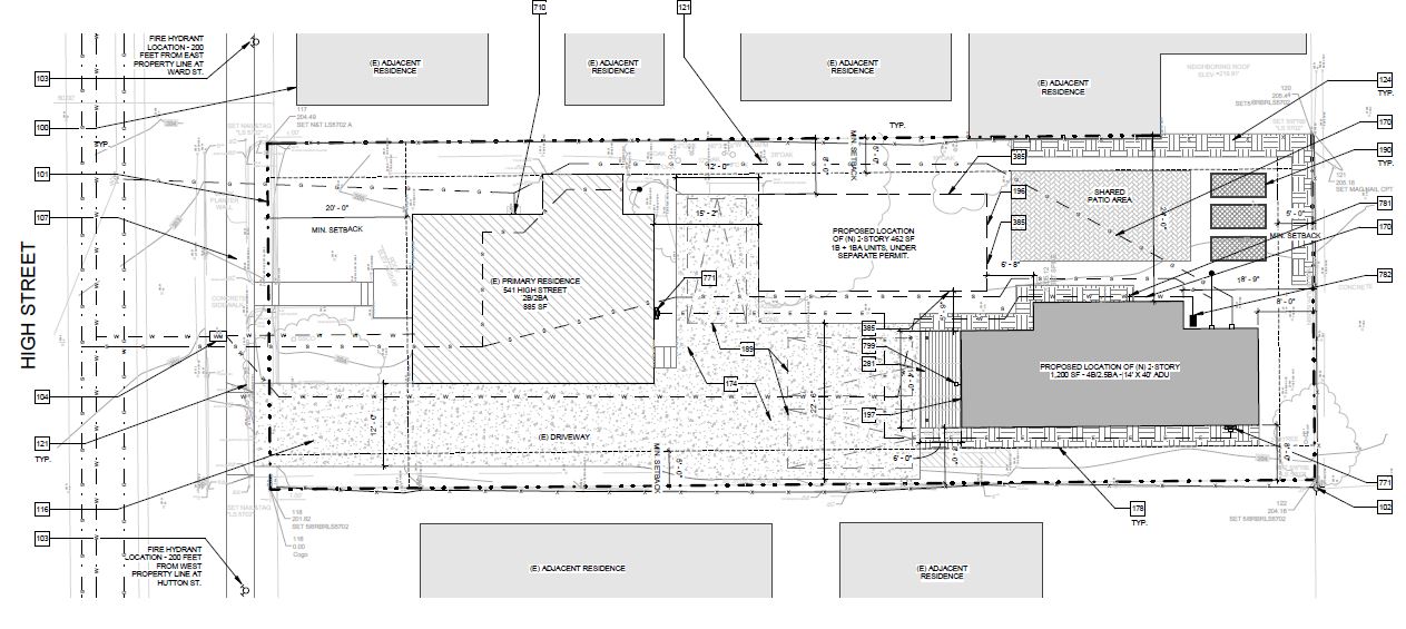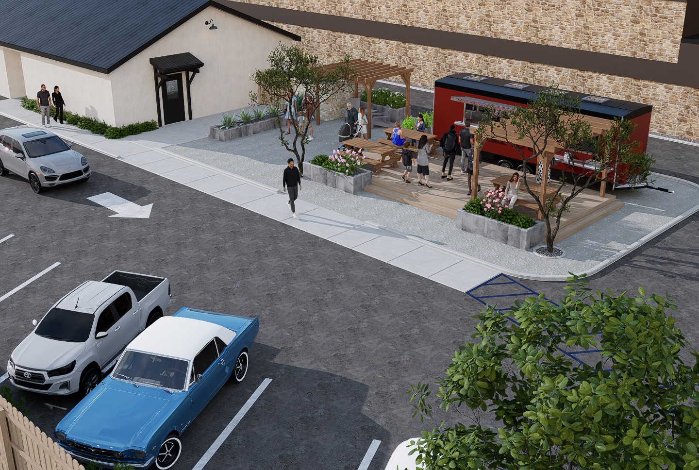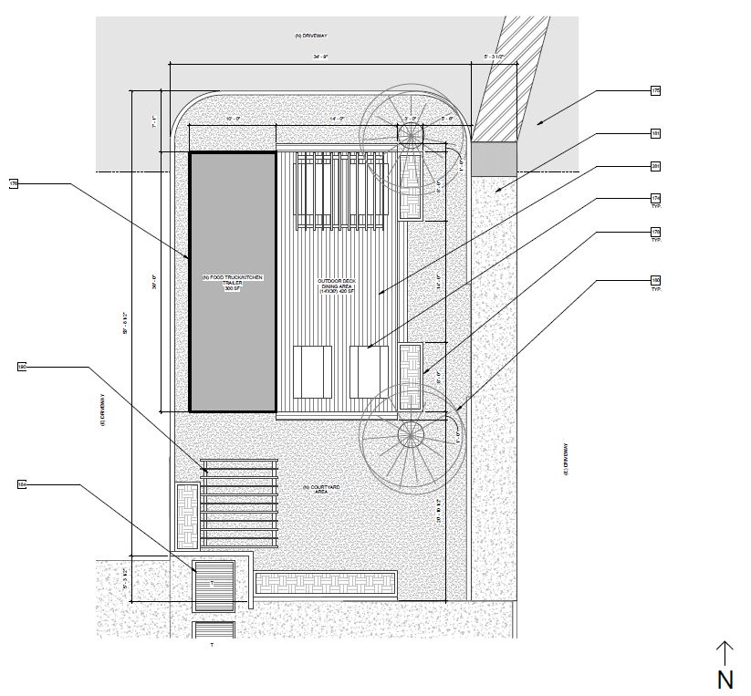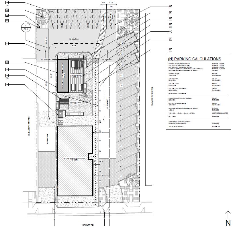 Situated in the heart of San Luis Obispo, CA, The Bunker coffee house hosts not only artisan coffee but beautiful art gallery and mural artwork on it's exterior walls. With California's beautiful weather, the client wished to expand the undeveloped area of the rear of the lot with a courtyard, foot trailer and additional parking.